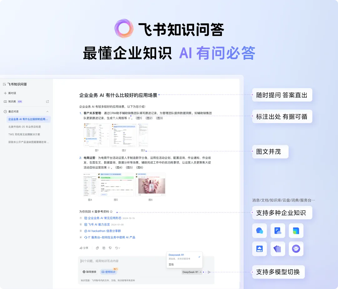 1. 知识问答:无可争议的“王牌” 深度盘活企业沉淀在飞书的知识资产(文档、聊天、会议),壁垒极高。 对知识密集型企业(科技、研发、咨询)而言,不是“有没有用”,而是“必须要有”。飞书生态的杀手锏。