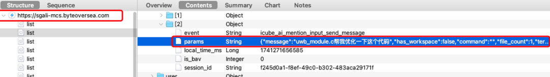 首先我们可以看到该请求是直接先发送到了 Trae 自己的服务器,然后我们把对应的请求内容 json 格式化看一下: