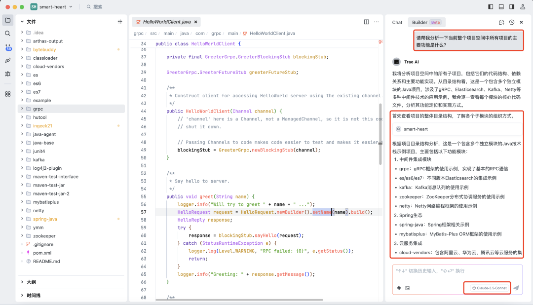 此时我们问 Trae 一个相同的问题:“请帮我分析一下当前整个项目空间中所有项目的主要功能是什么?”