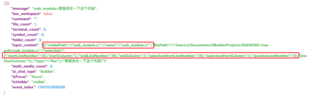 可以看到最终 input_content 参数中的内容,实际只是携带了当前要优化的文件名和该代码文件中从 13-16 行这个代码标识,而并不是直接上传了 13-16 行的代码块。