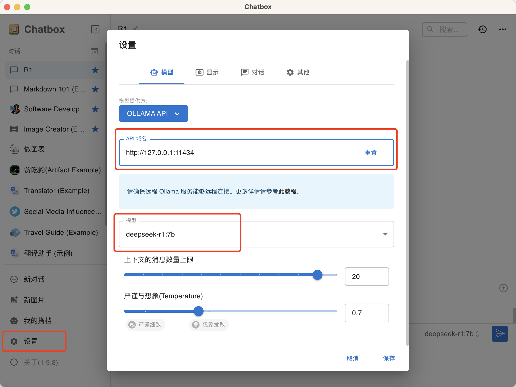 下载完成后我们在 ChatBox 的设置中填写 Ollama API 的地址和对应的模型名称,然后保存即可。