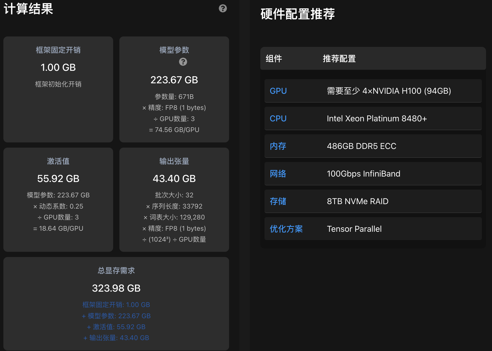 你只需要根据上面的概念选择自己的模型规模,便会自动计算出所需要的服务器资源。