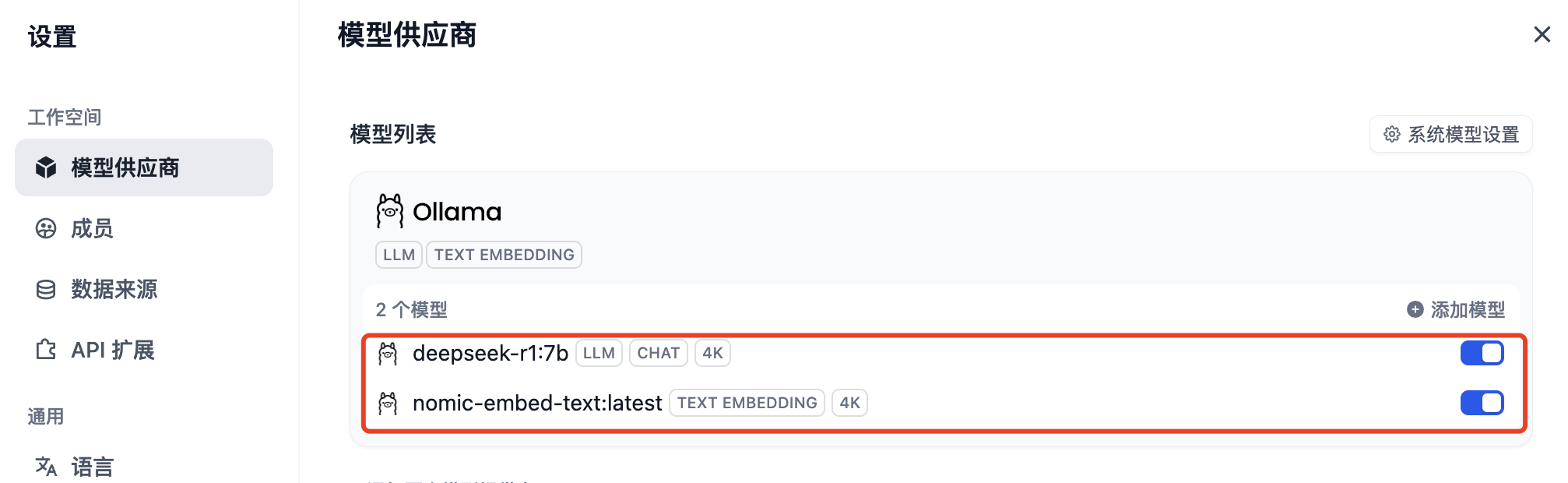 此时我们需要另外再部署一个新的模型,nomic-embed-text,这是一个文本向量化的模型,主要是后续基于 Dify 做向量化检索时使用。