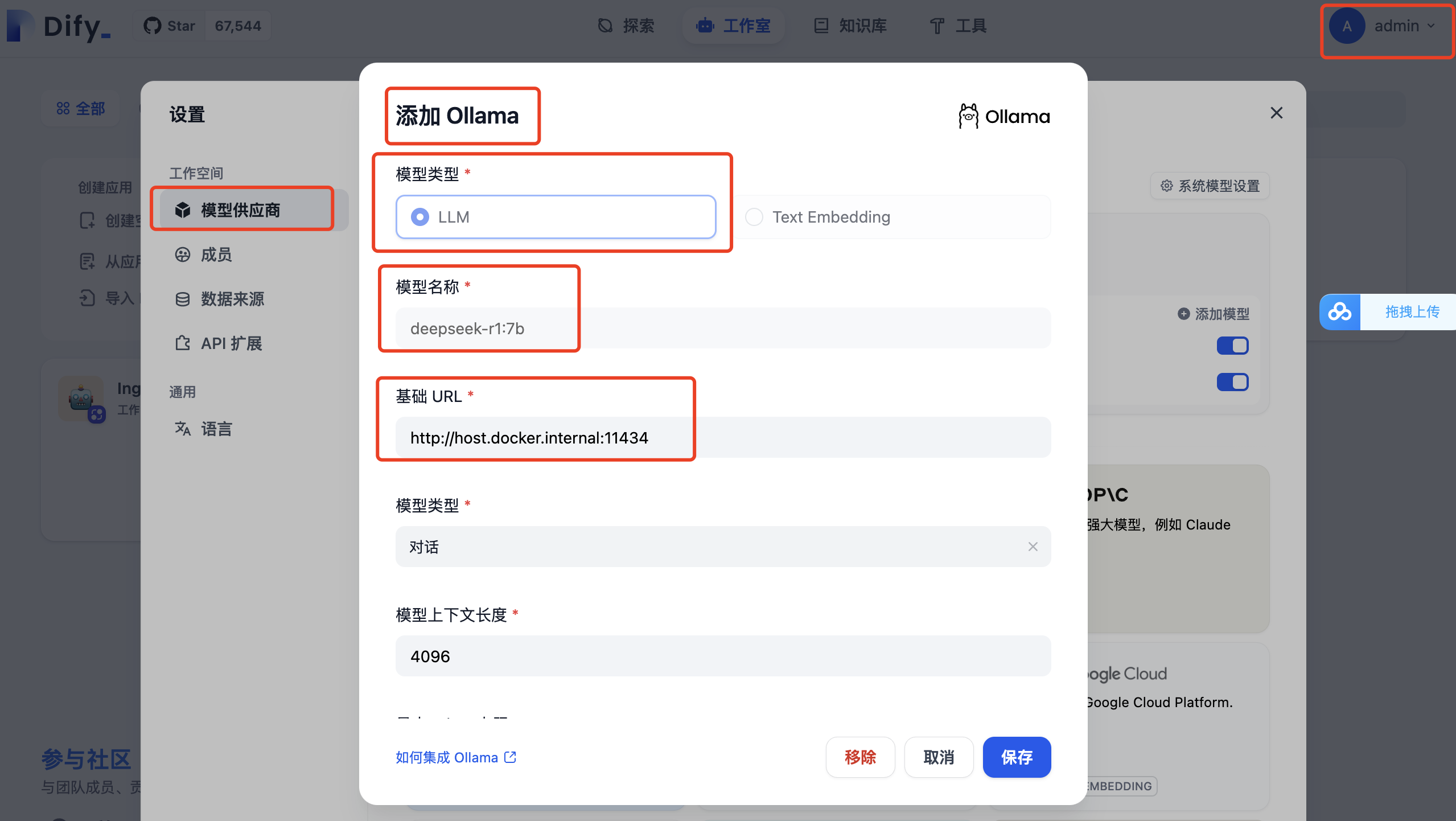 此时进入到 Dify 的主页面会提示新建账号密码,账号密码新建完成后,在右上角admin 处点击设置,然后新增我们的本地模型配置。