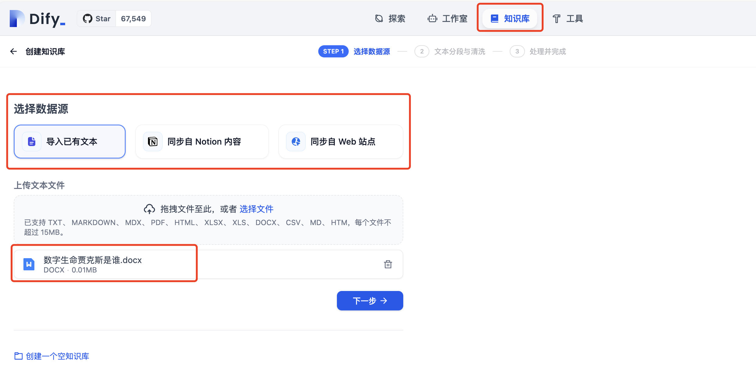 在对应的知识库模块新建知识库,并上传我们的私有数据