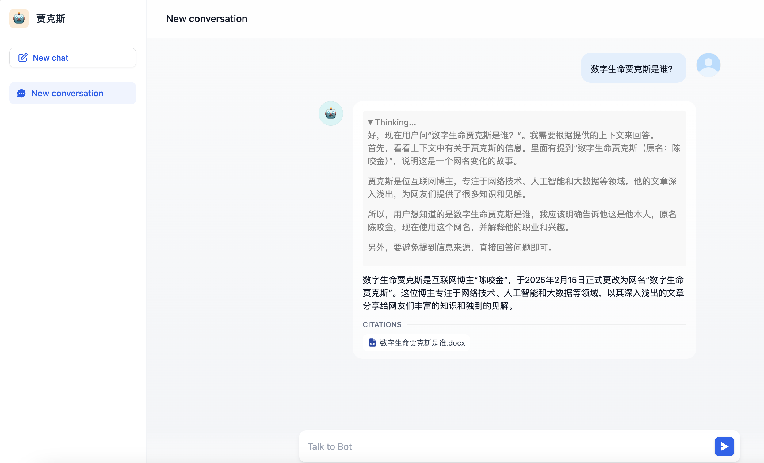 在机器人的上下文中选择我们刚刚新建的知识库:“数字生命贾克斯”