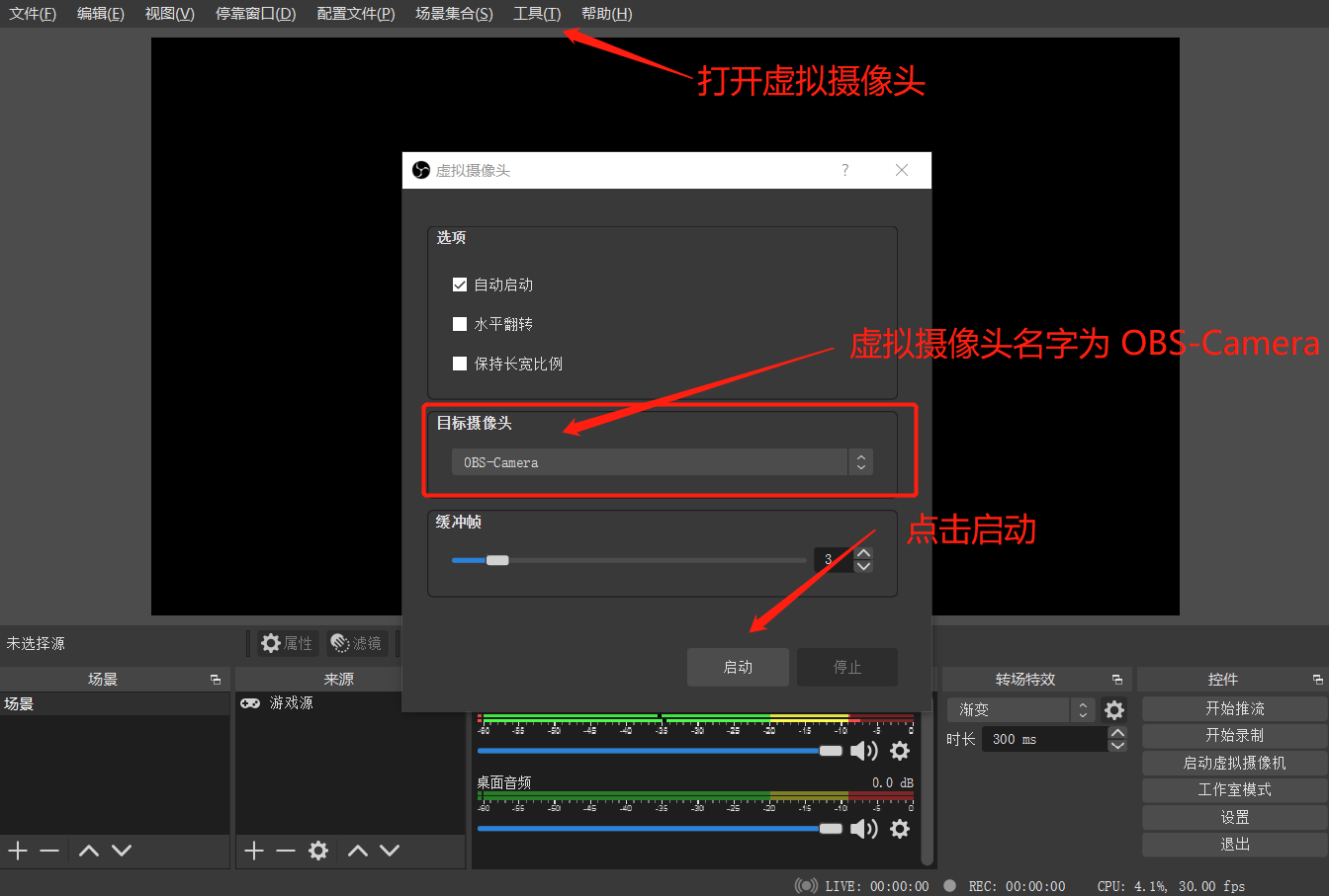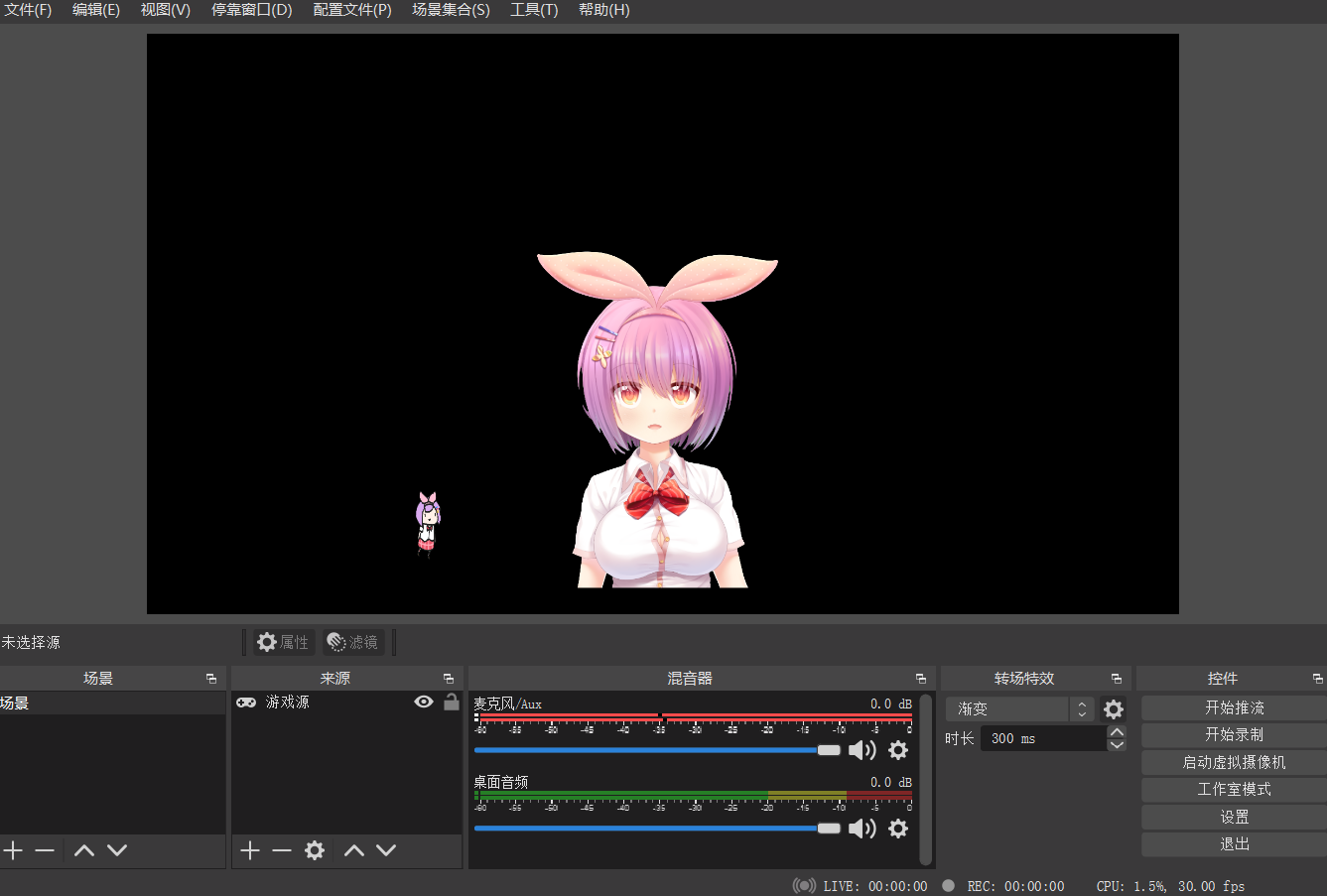 OK,此时调整完成,我们也已经使用OBS监听我们的VTube Studio的窗口了,接下来要做的则是,开启虚拟摄像头即可。