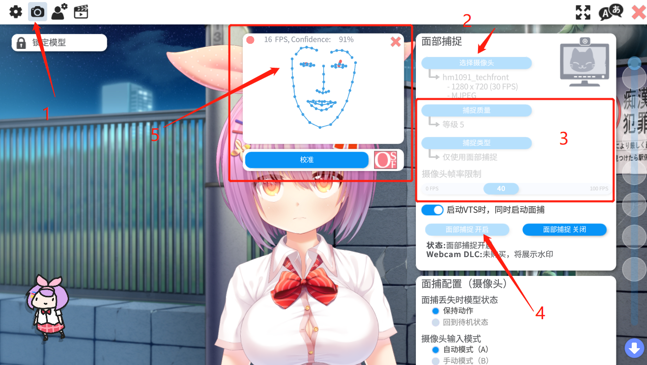 此时再次点击设置,选择摄像设置,然后选择对应要开启的摄像头,调整面部捕捉的设置后,最后开启面部捕捉。当我们开启面部捕捉后,将会看到 图“5” 中所显示的面部校准。校准完成后,则实时面部捕捉开启完成,然后退回到主页面即可。