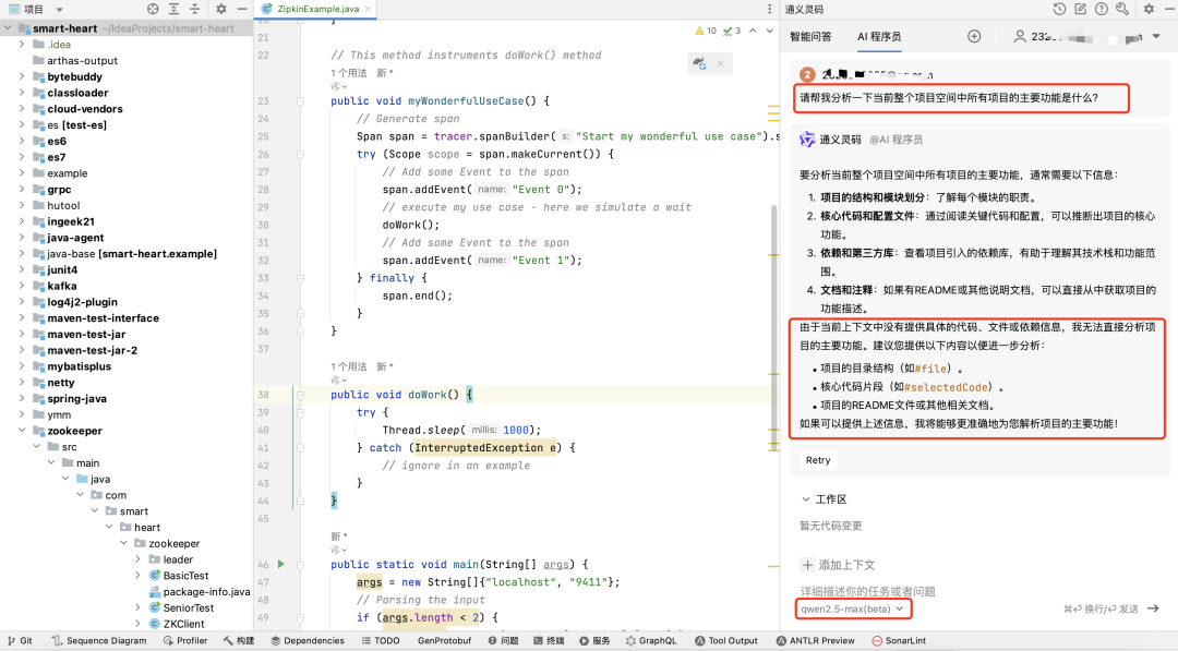 IDEA 打开该仓库后,使用通义灵码的“AI 程序员模式”来问一个简单的问题:“请帮我分析一下当前整个项目空间中所有项目的主要功能是什么?”