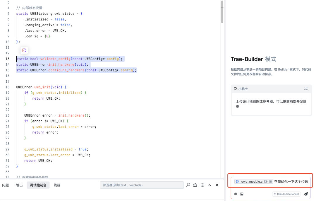此时我选中代码文件的 13-16 行,然后问题是“帮我优化一下这个代码”