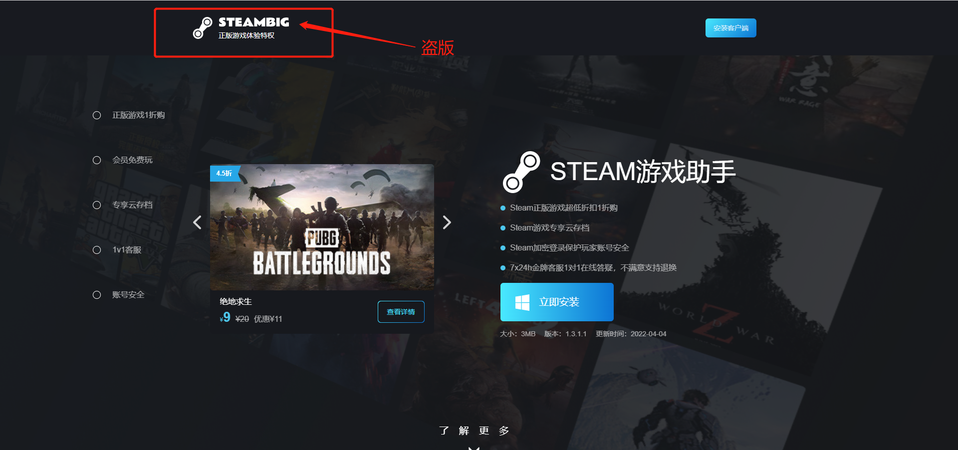 最初我还想着Steam国内也火了有几年了,百度上应该也有资源,于是直接百度搜索"Steam"后,给我引流到了一个叫做“StremBig”的网站上,于是下载安装注册,一套流程走下来,在资源库中搜索“VTube Studio” 发现并没有这款软件,然后Google搜了下“SteamBig和Steam”,特么... 原来SteamBig只是个租号平台...伪装成了Steam...醉了。