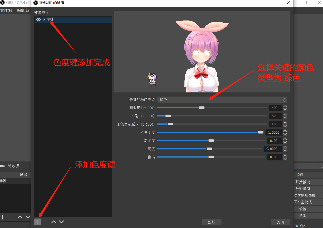 在对应新建的图层上,右键,选择“滤镜”,此时将打开一个新的滤镜窗口,并添加对应的色度键即可,如下所示: